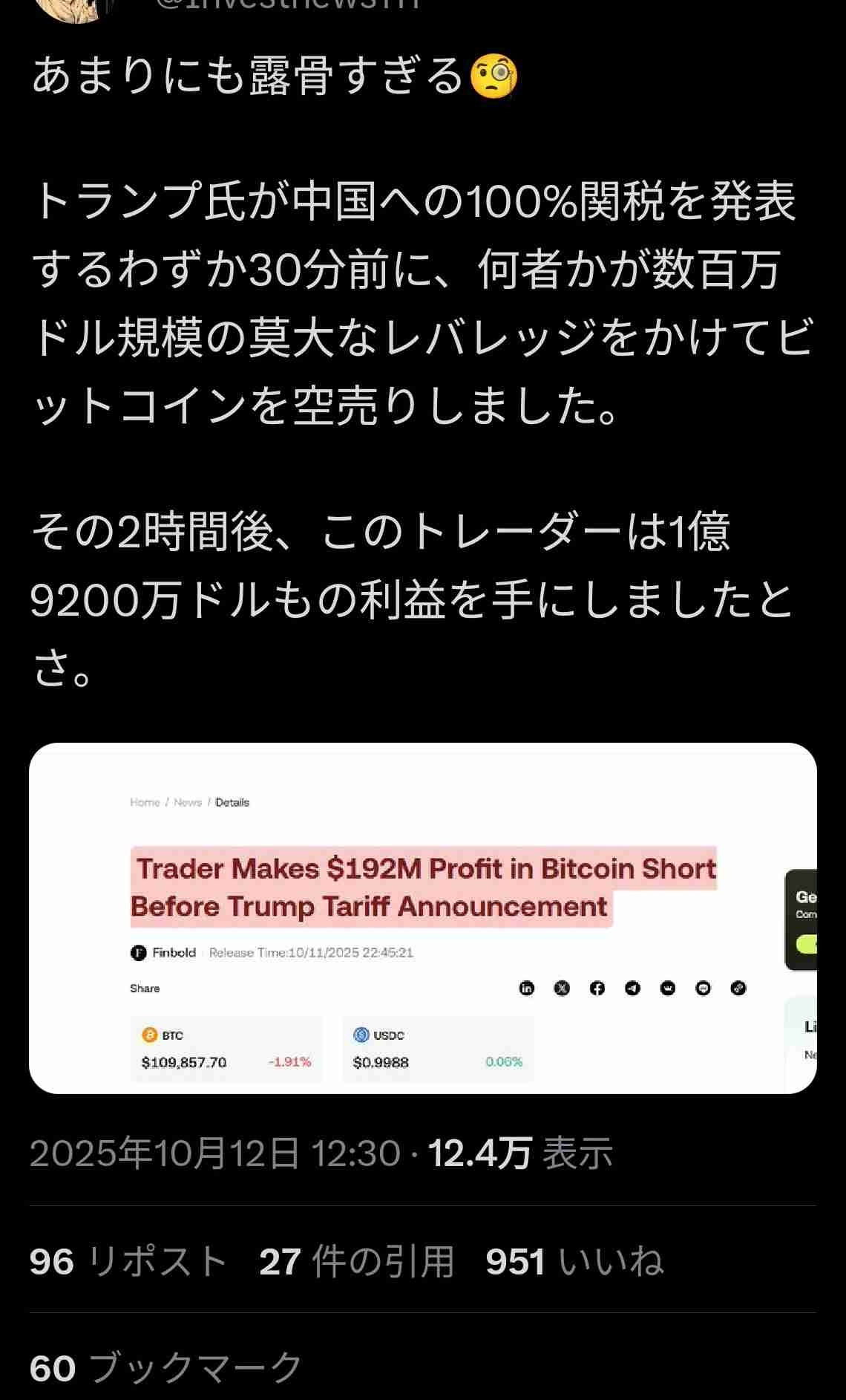 とりあえず今回トランプが中国関税発言する直前にビットコイン空売ったやつは300億円儲けた - 28 : 2025/10/13(月) 07:57:07.380 ID:mpHd7AlJS