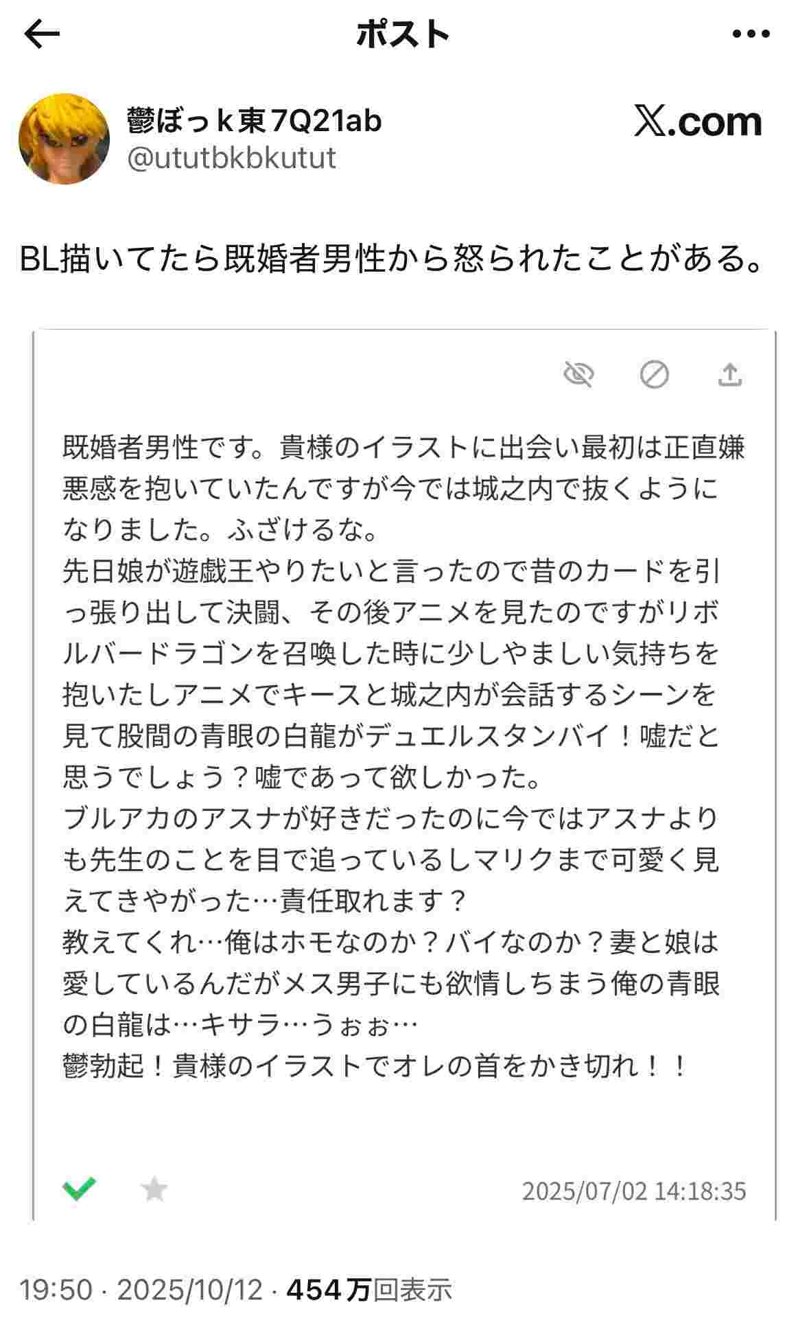 Xの腐女子「待って、BL書いてたら既婚者男性からコメント来たんだけどwww」