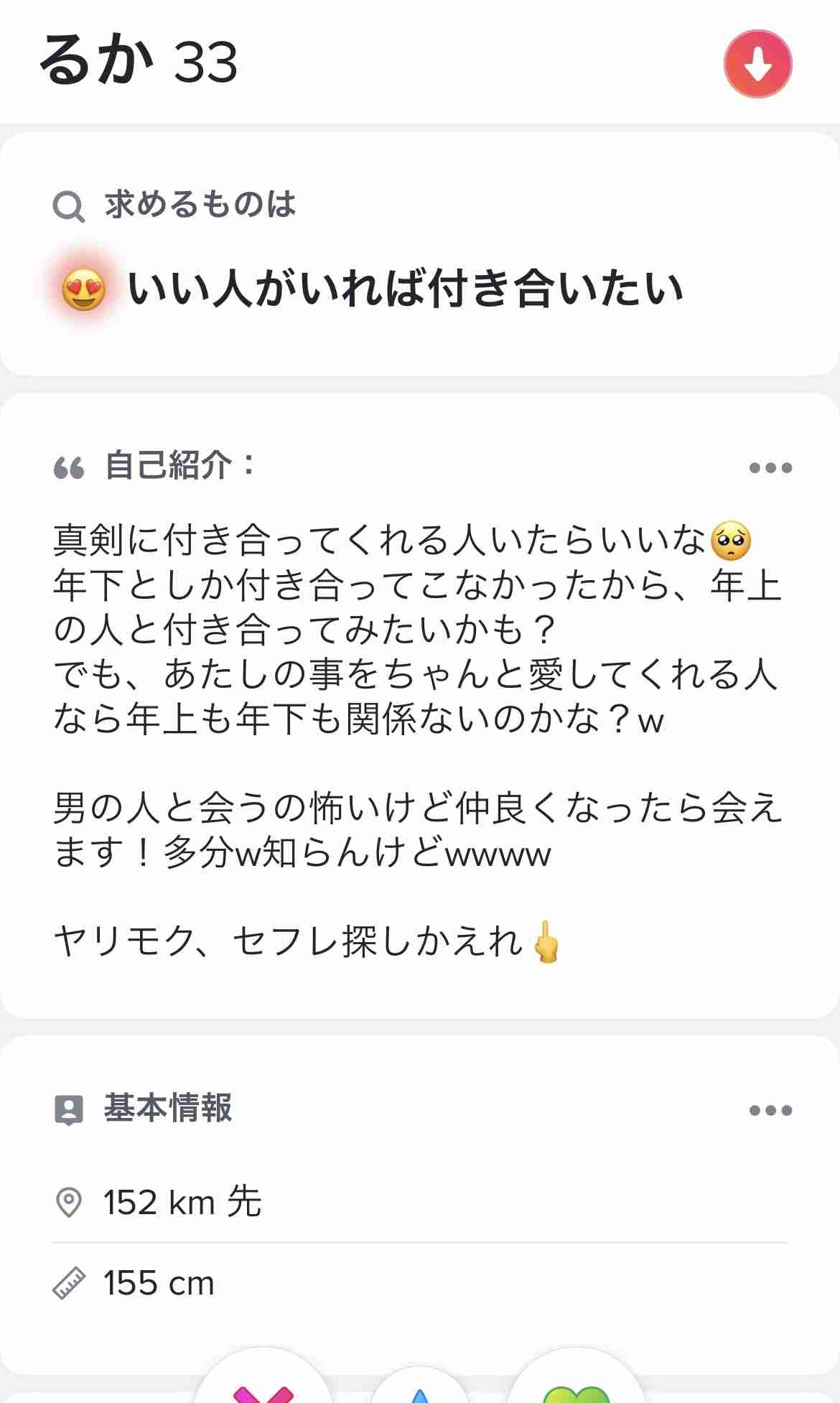 真面目に相手を探すつもりがないのか照れ隠しなのか知らんが33が子供みたいな文体使って出会い探してるって恐怖でしかないやろ - 53 : 2025/10/16(木) 19:16:23.079 ID:6b3Ung/Nn