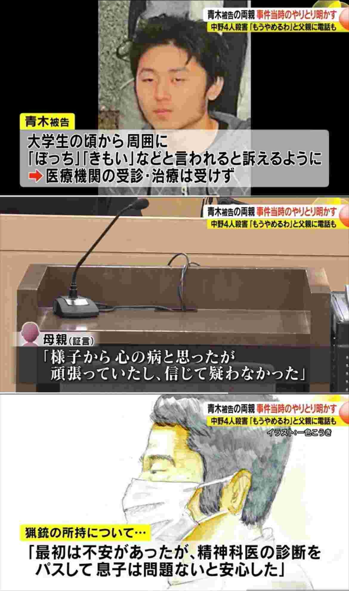 青木被告はおととし5月、長野県中野市の自宅近くで散歩をしていた近所の女性2人と駆け付けた男性警察官2人を殺害したとされています。ひとりぼっちを意味する「ぼっち」と言われたという妄想が動機とされました。 - 5 : 2025/10/18(土) 13:25:07.928 ID:hgf8jkmca