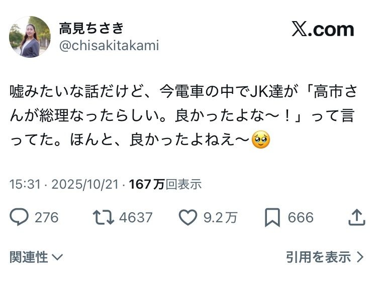 普通の日本人「嘘みたいな本当の話なんだけどJKの集団が高市さんがそうになって良かったと言ってるのを聞いた」10万いいね