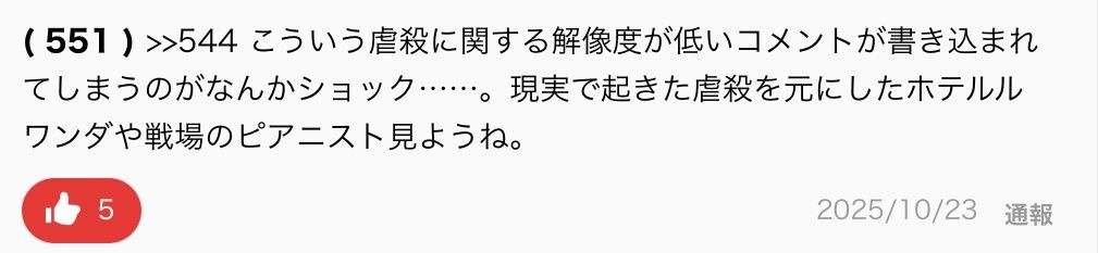 ワイ「虐殺のシーンに対して教養ないから想像力がおよばないんやろな……可哀想」