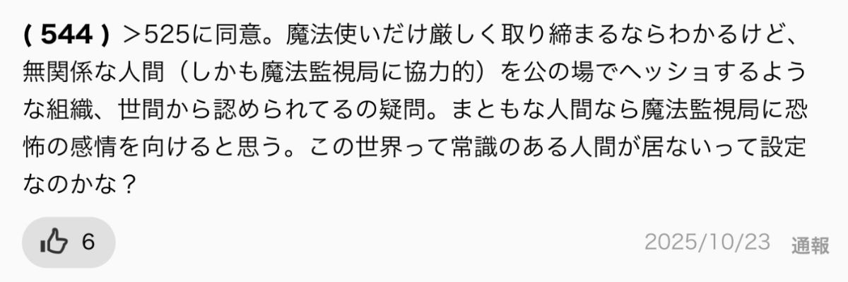 このジャンプラの新連載やね[第1話]WITCHRIV - はくり | 少年ジャンプ+魔法使いであることを隠し人間社会で暮らすノナ。親友ロヴィと穏やかな日々を過ごしていたが、ある日ロヴィの壊れたメガネを魔法で直したことで「魔法監視局」に目をつけられる。小さな優しさが引き金となり、ノナの運命が大きく動き出す――。shonenjumpplus.com - 54 : 2025/10/23(木) 21:20:27.813 ID:wig.HEYhc