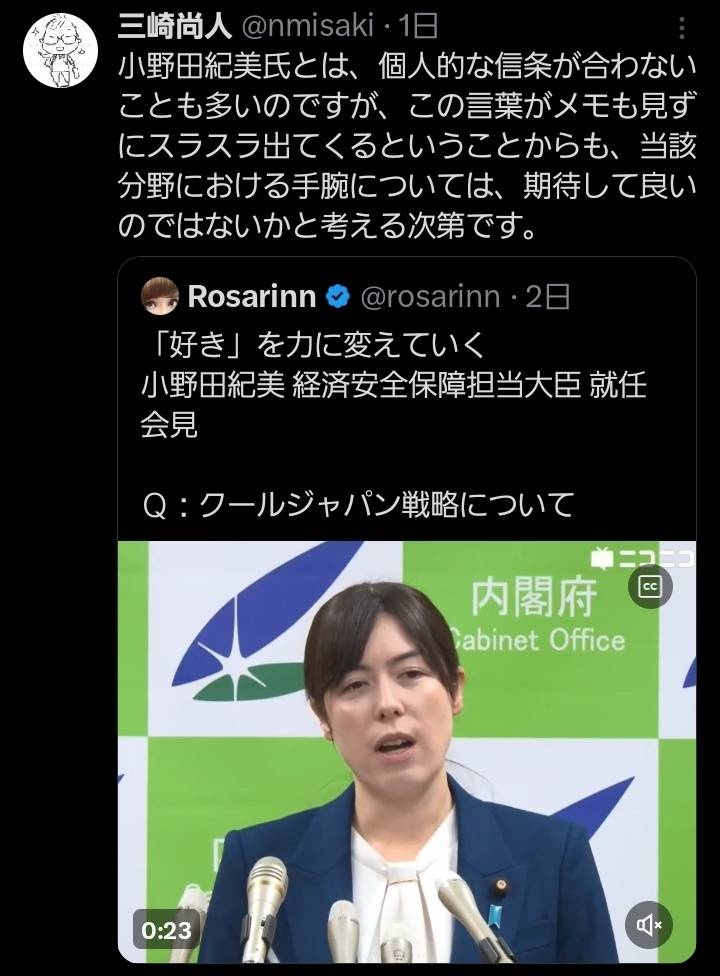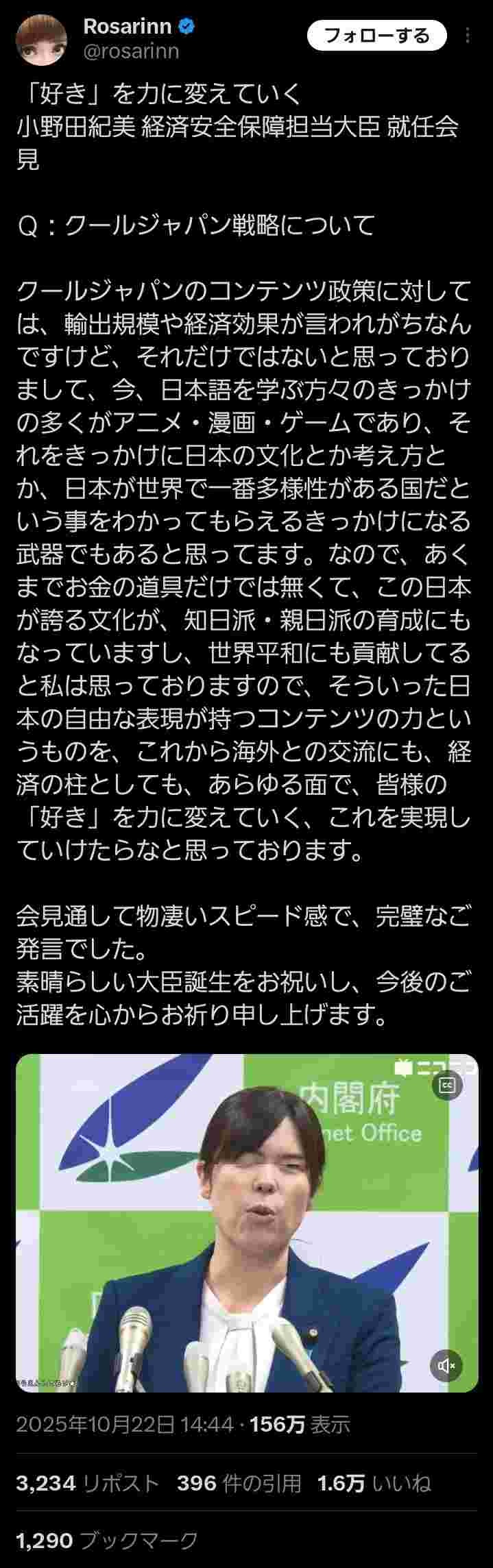 オタク「小野田大臣はメモも見ずにアニメの素晴らしさを語った。彼女は信用できる」5万いいね