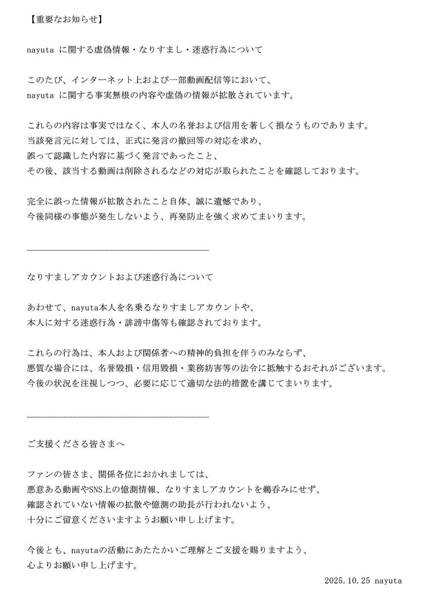 nayutaに関する虚偽情報・なりすまし・迷惑行為について - 2 : 2025/10/25(土) 12:08:37.168 ID:5TRBCdim0