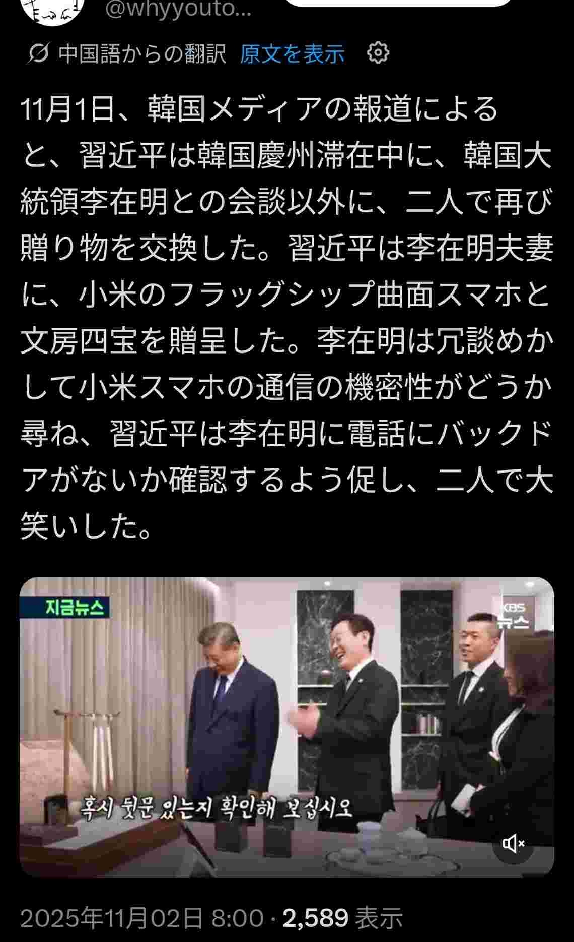 🇨🇳習近平、🇰🇷李在明にXiaomiのスマホをプレゼント「バックドアあるかどうか見てみてよ」→大ウケ