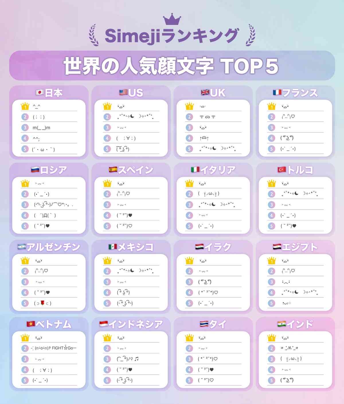 - バイドゥ株式会社(本社:東京都港区、代表取締役社長 Feng Jiang)が提供するきせかえ顔文字キーボードアプリ「Simeji」は、10月10日が『顔文字コミュニケーションの日』として正式に認定されたことを記念し、世界16カ国における顔文字の利用動向や使われ方を調査し、2025年に各国で最も多く使われた人気顔文字TOP5を発表します。