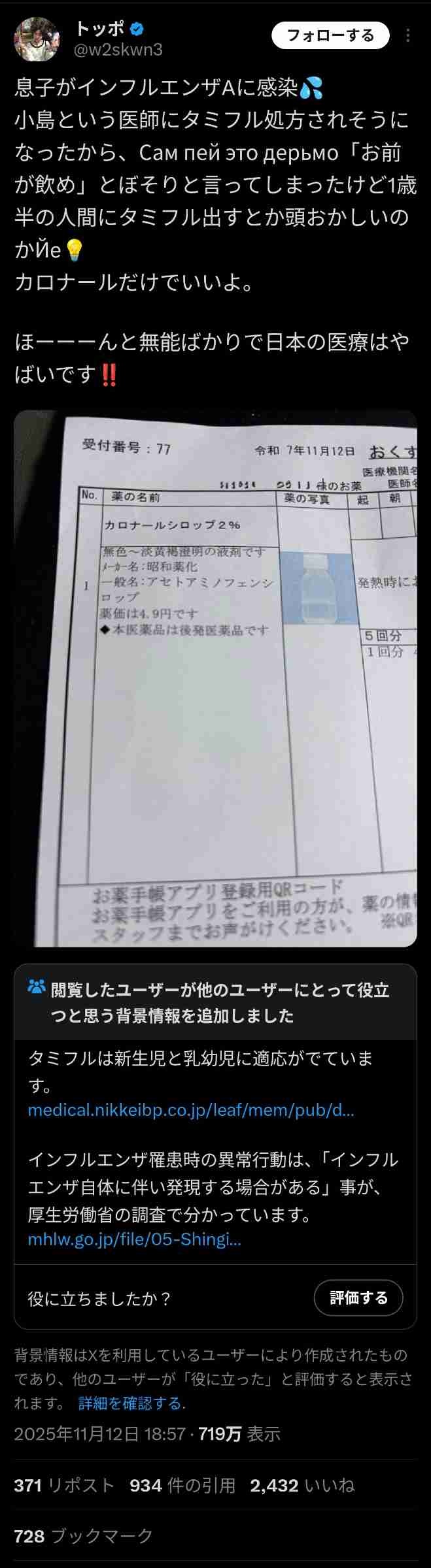 医者「お子さんはインフルエンザですね、タミフルを処方します。」母「Сам пей это дерьмо」