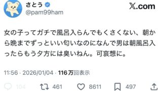 エッヂ 【画像】女の子「女の子って風呂入らなくても臭くないし朝から晩までいい匂いなのに男は朝風呂しても夕方には臭い。可哀想」