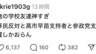 中学二年生「俺の学校友達神すぎ🤣 移民反対と高市早苗支持者と参政党支持者と右翼しかおらん🥰」1万いいね!!!